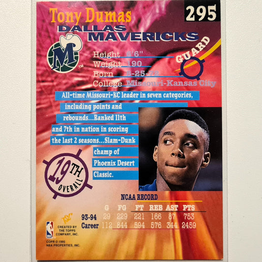 Tony Dumas 1995 Topps Stadium club draft pick 94 Rookie RC #295 NBA Basketball Dallas Mavericks Very good Sleeved