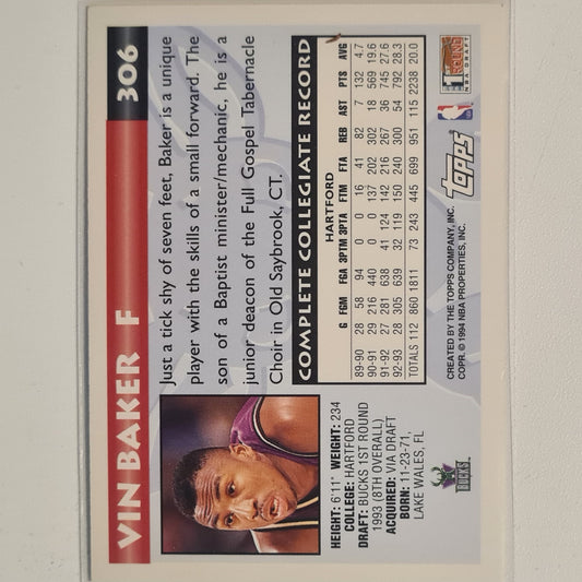 Vin Baker 1994 Topps 1st round NBA Draft #306 Rookie RC* NBA Basketball Milwaukee Bucks excellent Sleeved