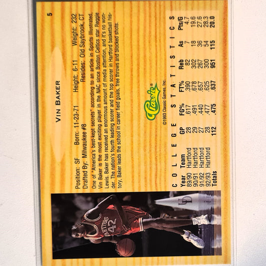 Vin Baker 1993 Classic Draft Picks Rookie RC #5 NBA Basketball Hartford Excellent/mint Sleeved