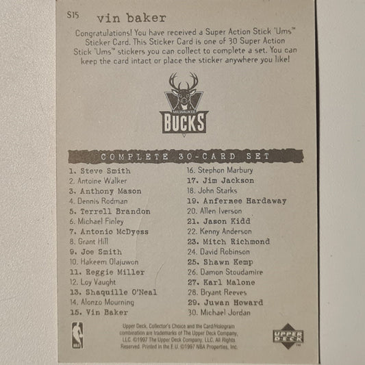 Vin Baker 1997 Upper Deck Stick-ums S15 NBA Basketball Milwaukee Bucks Excellent sleeved