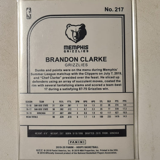 Brandon Clarke 2019-20 Panini NBA Hoops Rookie RC #217 NBA Basketball Memphis Grizzlies Excellent sleeved