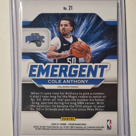 Cole Anthony 2020-21 Panini Prizm Emergent Rookie RC #21 NBA Basketball Orlando Magic Excellent/mint