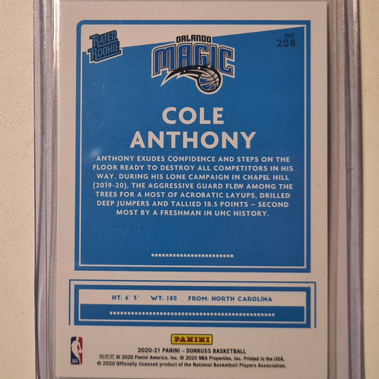 Cole Anthony 2020-21 Panini Donruss Rated Rookie RC #208 NBA Basketball Orlando Magic Excellent/mint