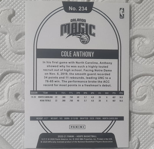 Cole Anthony 2020-21 Panini NBA Hoops blue purple Rookie RC #234 NBA Basketball Orlando ex-mint