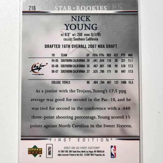 Nick Young 2007-08 Upper Deck first edition star rookies rookie RC #216 NBA Basketball usc/Washington Wizards excellent sleeved