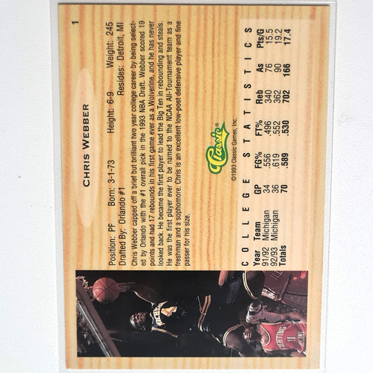 Chris Webber 1993 Classic #1 NBA Basketball Michigan Draft picks rookie superb Sleeved