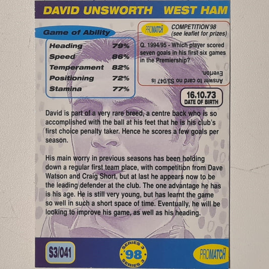 David Unsworth 1998 promatch 98 series 3 premiership #041 Football West Ham United Ex-mint