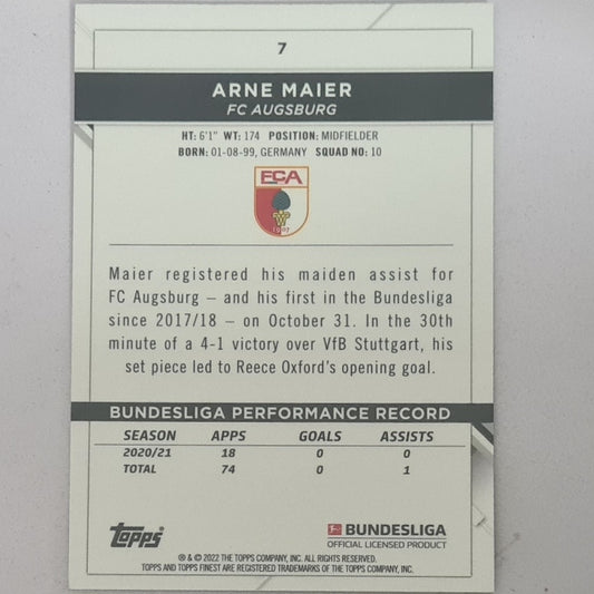 Arne Maier 2022 Topps Finest Bundesliga Rookie RC #7 Soccer Football Augsburg EX-MINT