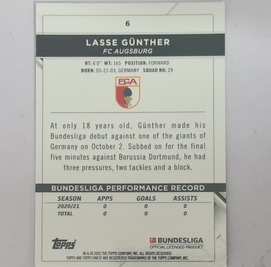Lasse Gunther 2022 Topps Finest Bundesliga Rookie RC #6 Soccer Football Augsburg EX-MINT
