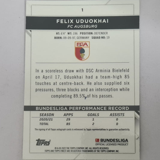 Felix Uduokhai 2022 Topps Finest Bundesliga refractor #1 Soccer Football Augsburg EX-MINT