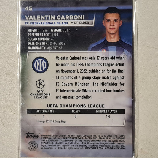 Valentin Carboni 2023 Topps Stadium Club Champions League Rookie RC #45 Football Inter Milan ex-mint sleeved