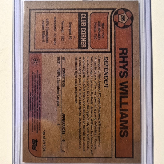 Rhys Williams 2021 Topps living SET rookie RC #295 Soccer Football Liverpool FC Excellent/Mint Sleeved