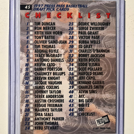 Tim Duncan 1997 Press Pass 97 checklist rookie RC #45 NBA Basketball Wake Forest/San Antonio Spurs excellent Sleeved