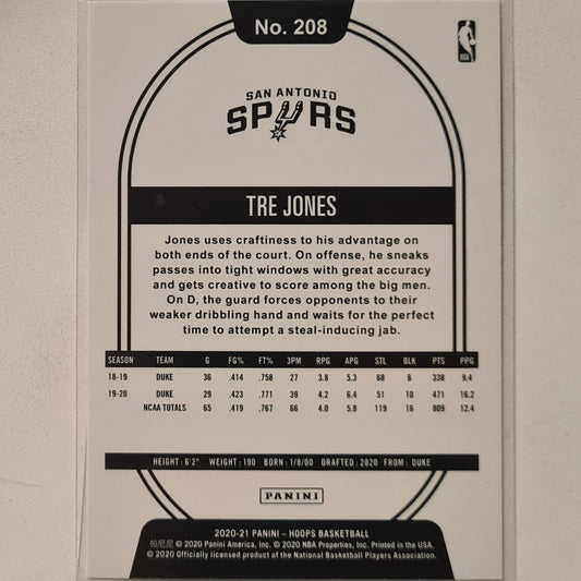 Tre Jones 2020-21 Panini NBA Hoops rookie RC #208 NBA Basketball San Antonio Spurs excellent/mint Sleeved
