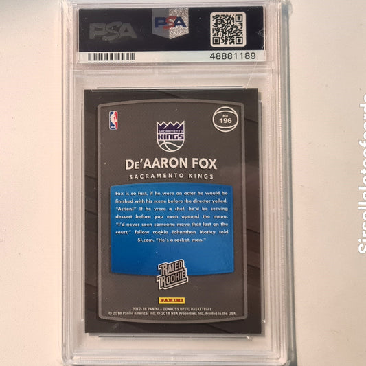 De'Aaron Fox 2017-18 Panini Donruss Optic Rated Rookie RC #196 NBA Basketball Sacramento Kings PSA 9 Mint graded slab