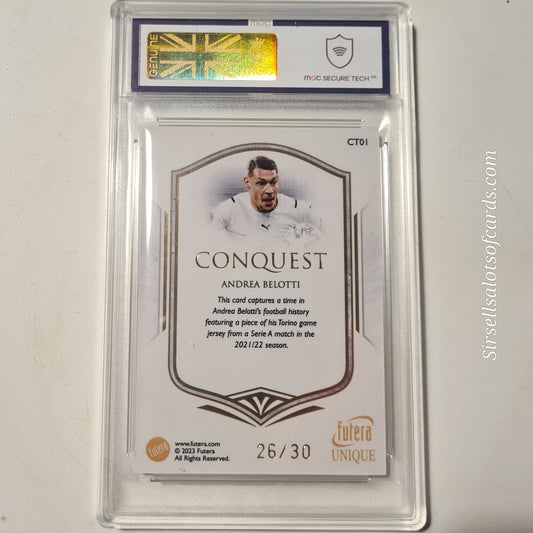 Andrea Belotti 2023 Futera Unique Conquest relic patch 26/30 CT01 football Torino MGC Graded Gem 10 slabbed