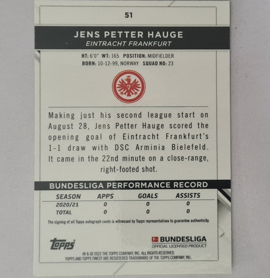 Jens Petter Hauge 2022 Topps Finest Bundesliga Refractor #51 Soccer Football Eintracht Frankfurt mint sleeved