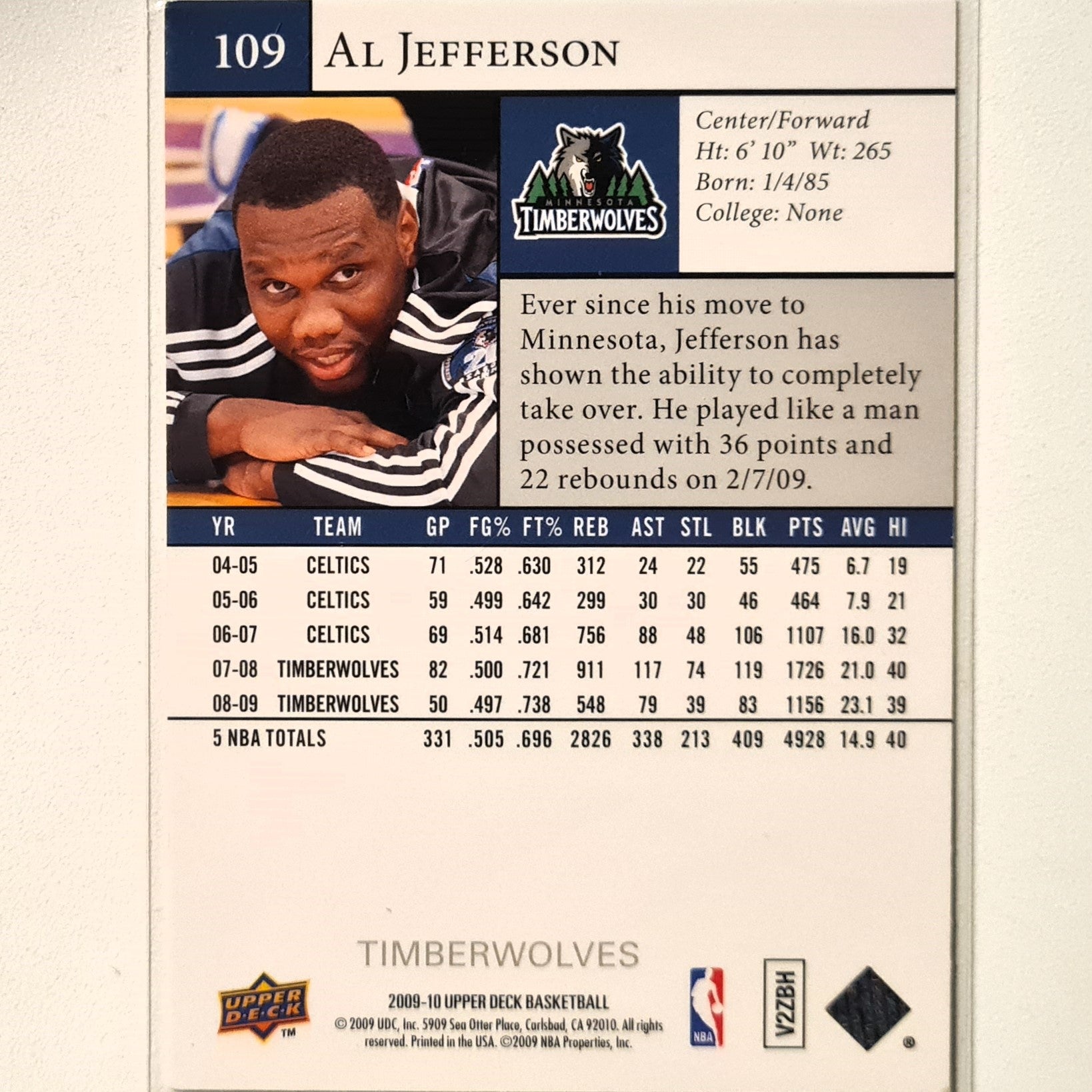 Al Jefferson 2009-10 Upper-Deck #109 NBA Basketball Al Jefferson good-very good sleeved