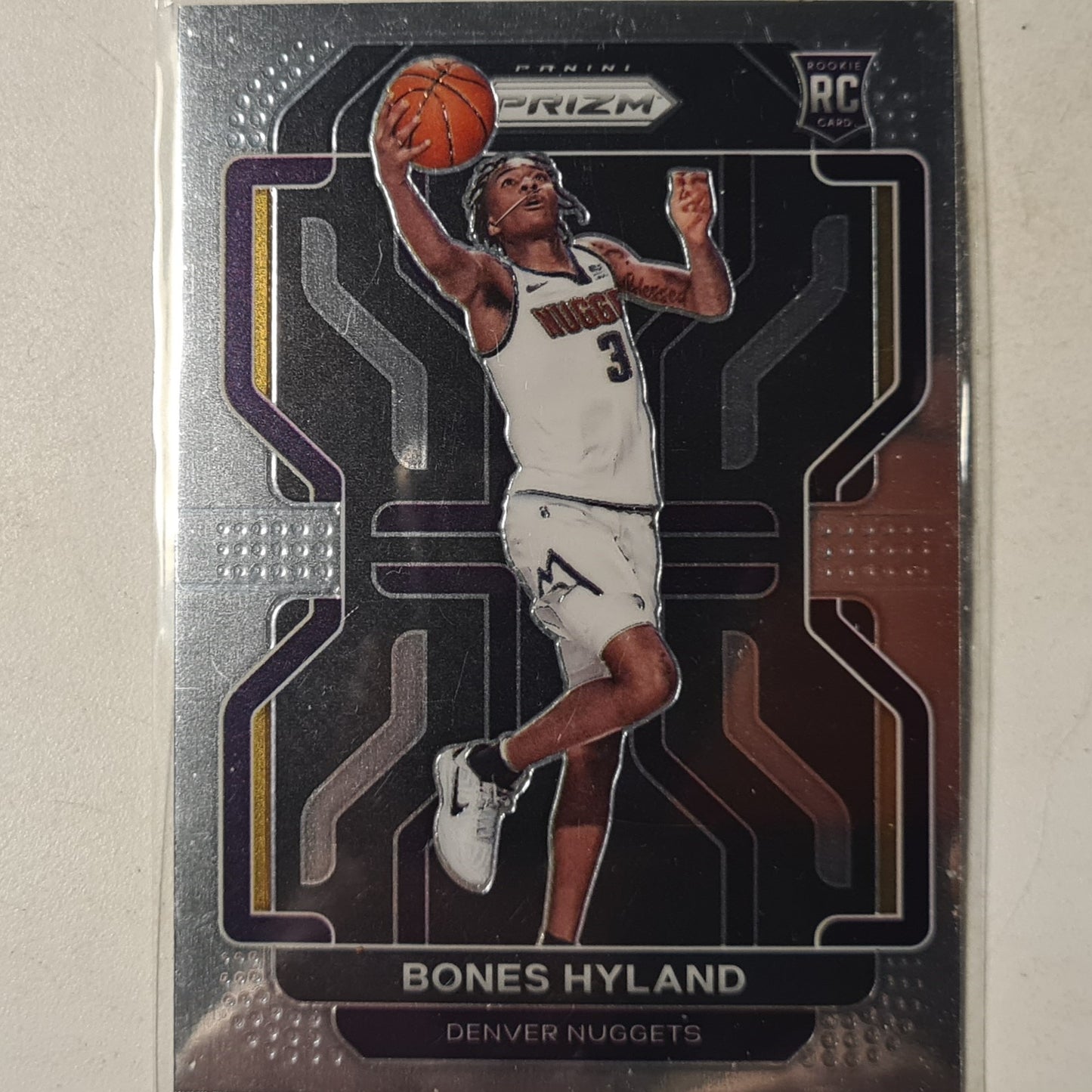 Welcoming Bones Hyland to the NBA! This 2021-22 Panini Prizm Rookie RC card features an error of "Buddy Held" on the rear, adding a unique element to your collection. As a Denver Nuggets player, Hyland brings excellent skills to the court. Don't miss out on this one-of-a-kind card!