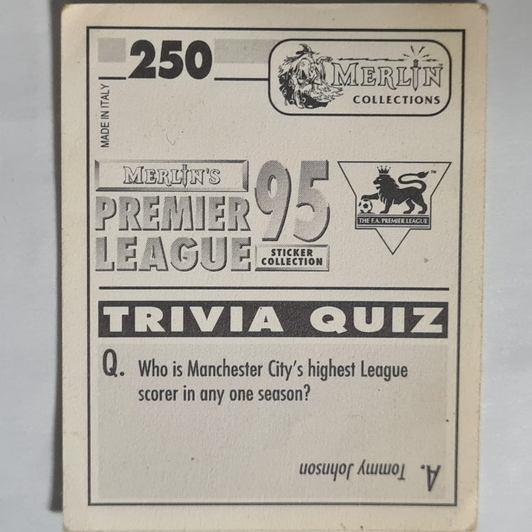 Rare collectible featuring Liverpool defender Dominic Matteo from the iconic 1995 Merlin Premier League sticker collection. This #250 sticker shows fair-to-good condition, perfect for nostalgic fans and serious collectors looking to complete their 90s football memorabilia.