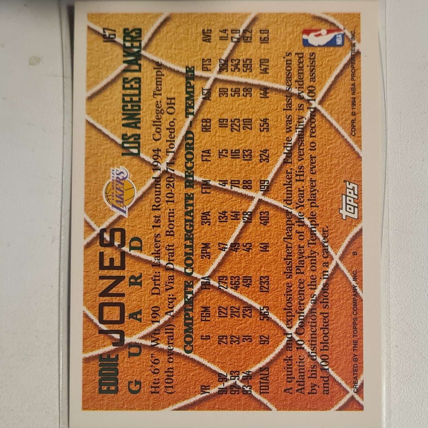This Eddie Jones rookie card from the 1994 Topps NBA Draft showcases his talent as a LA Lakers player. In excellent near-mint condition, it's a must-have for any NBA fan or collector.