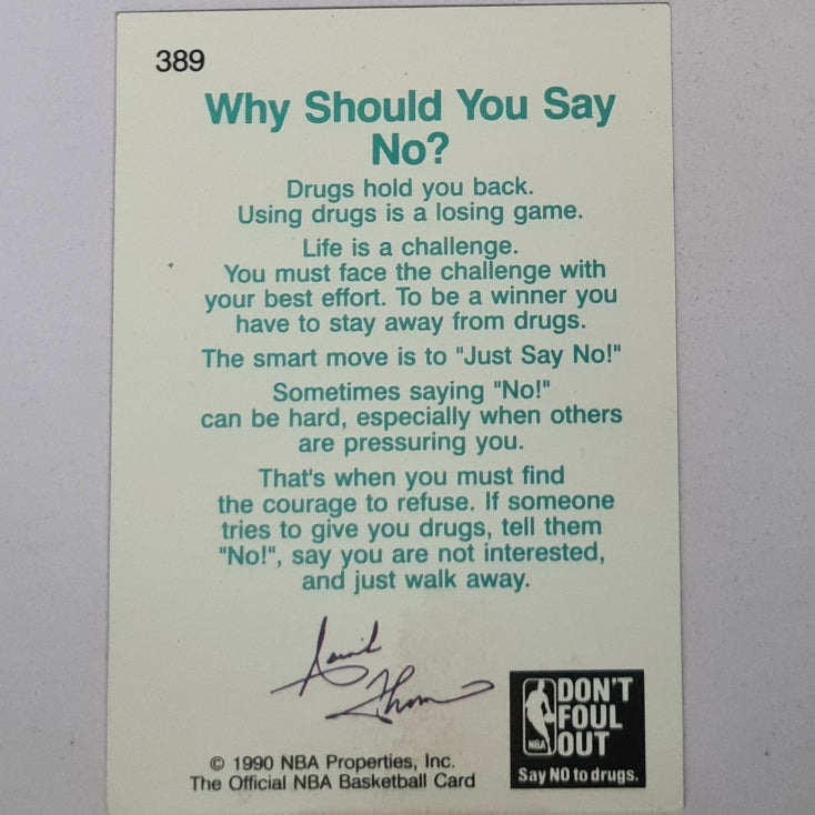 Authentic Isiah Thomas 1990 NBA Hoops "Say No To Drugs" #389 card featuring the Detroit Pistons legend. This collectible basketball card is in very good condition, perfect for Pistons fans and serious NBA memorabilia collectors. A meaningful piece of basketball history with an important anti-drug message.