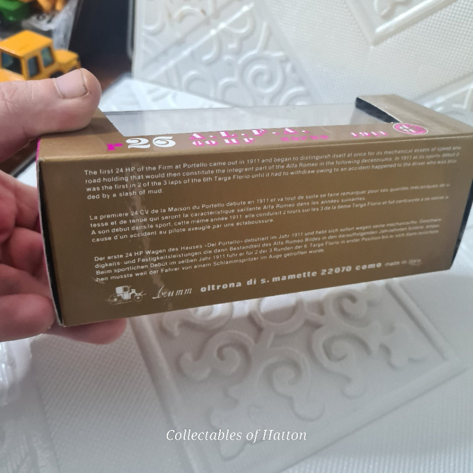 Discover this exceptional Brumm R66 1:43 scale diecast model of the legendary 1911 Alfa Romeo Corsa racing car. Meticulously crafted with authentic period details, this vintage-inspired collectible captures the elegance and performance heritage of early motorsport. Presented in pristine mint condition within its original packaging, it's an ideal addition for enthusiasts of classic Italian automobiles and serious model collectors. A timeless piece that celebrates automotive history with quality craftsmanship.