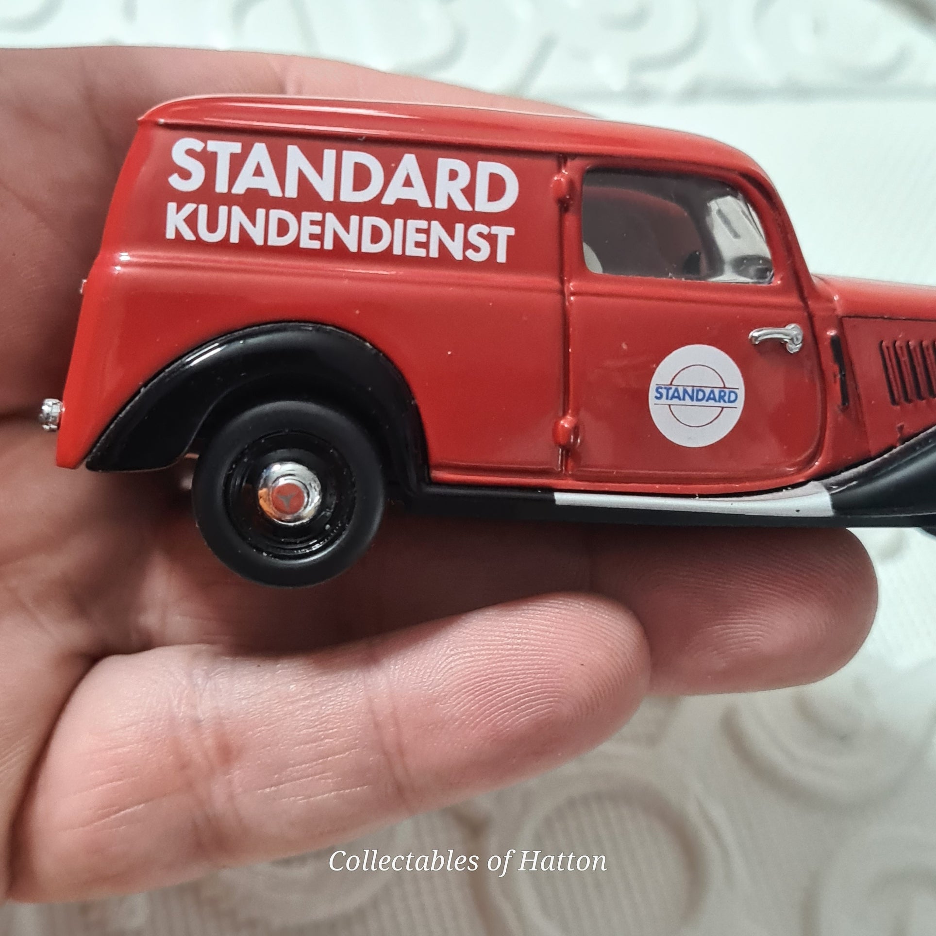 This Schuco 1:43 scale Mercedes 170v Standard Kundendienst delivery van captures a classic piece of automotive history. The detailed diecast model faithfully reproduces the iconic German service vehicle with authentic livery and period-correct styling. In very good condition and presented loose, it's ideal for collectors seeking a quality vintage representation without original packaging. A charming addition to any diecast collection, celebrating mid-century commercial vehicle design.